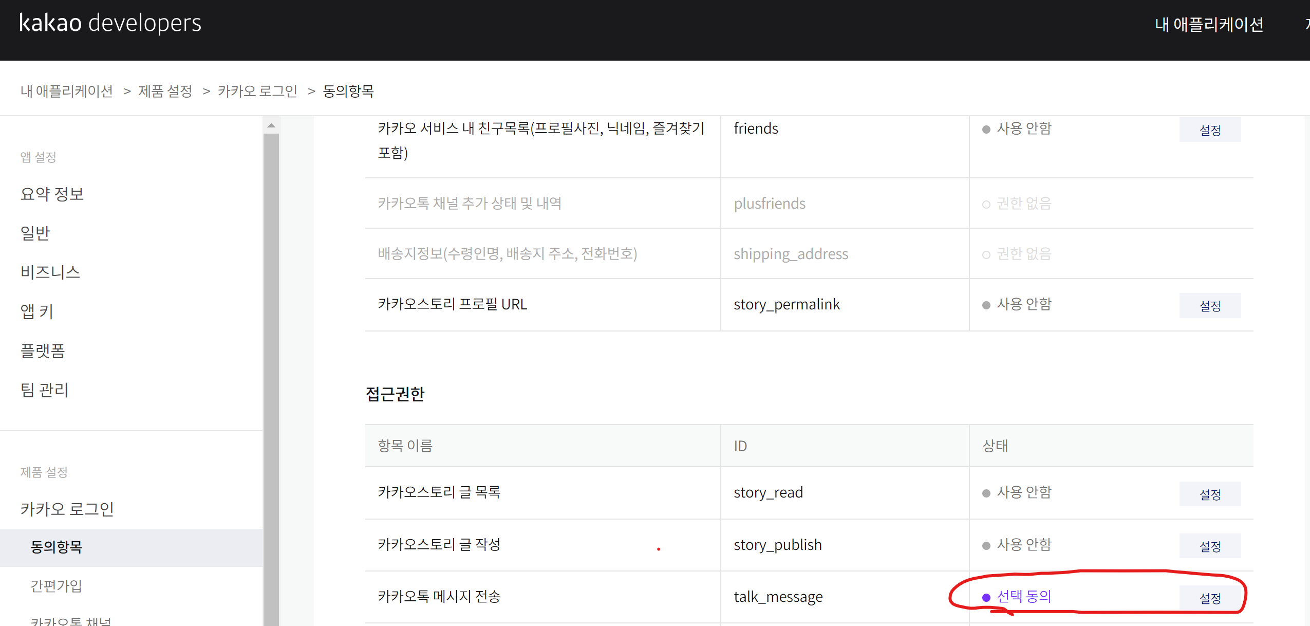 3. 카카오 로그인 -> 동의 항목에서 "카카오톡 메시지 전송"을 설정한다.